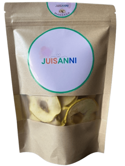 Pura fruta concentrada: Cada paquete de 50g de Juisanni contiene el equivalente a casi medio kilo de manzana fresca nacional, deshidratada lentamente para concentrar todo su sabor y nutrientes naturales sin añadir nada más.”